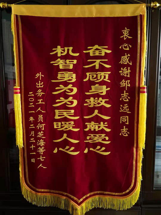 送給鄒志(zhì)遠(yuǎn)同志(zhì)的(de)錦旗,感謝(xiè∏↔)他(tā)奮不(bù)顧身(shēn)救人(rén)行∑™≥(xíng)為(wèi)。